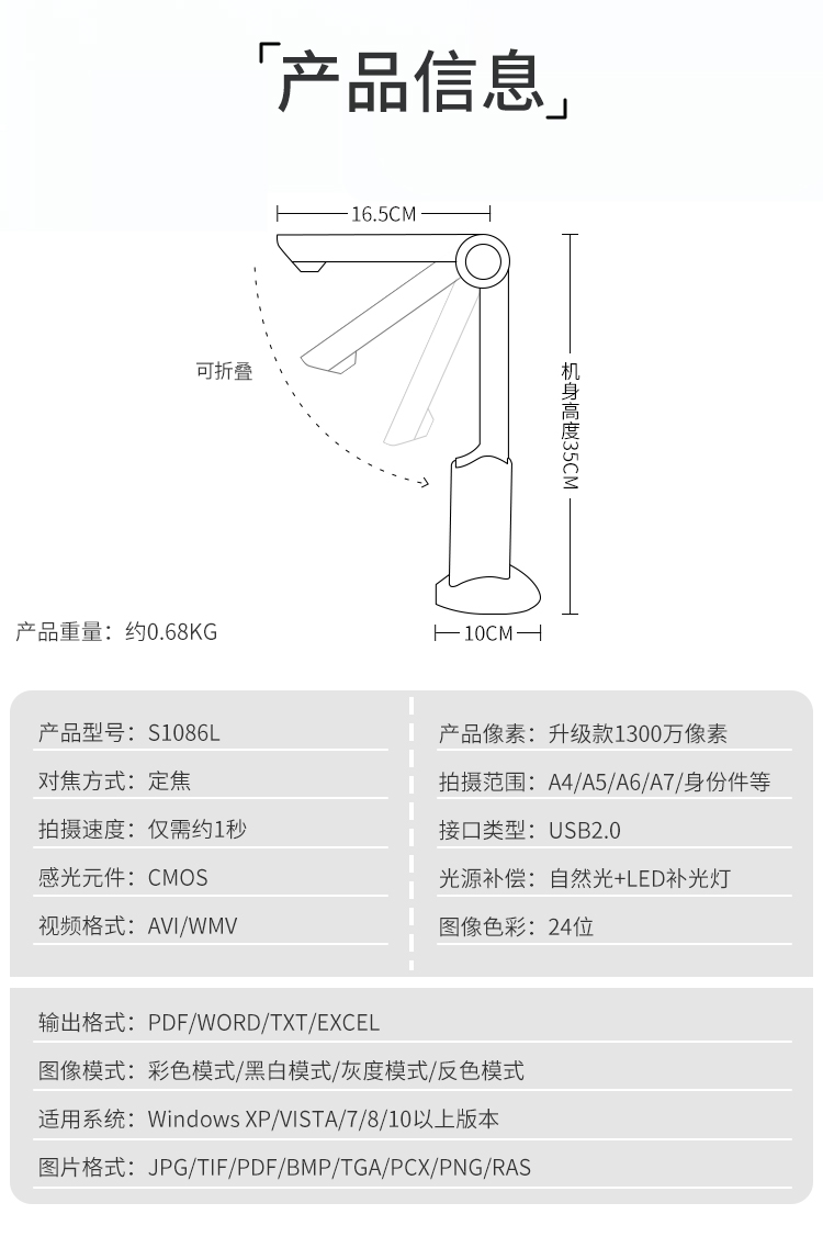 良田高拍仪高速扫描仪1300万高清扫描A4定焦连续扫描身份证文件票据自动纠偏OCR文字识别S1086L